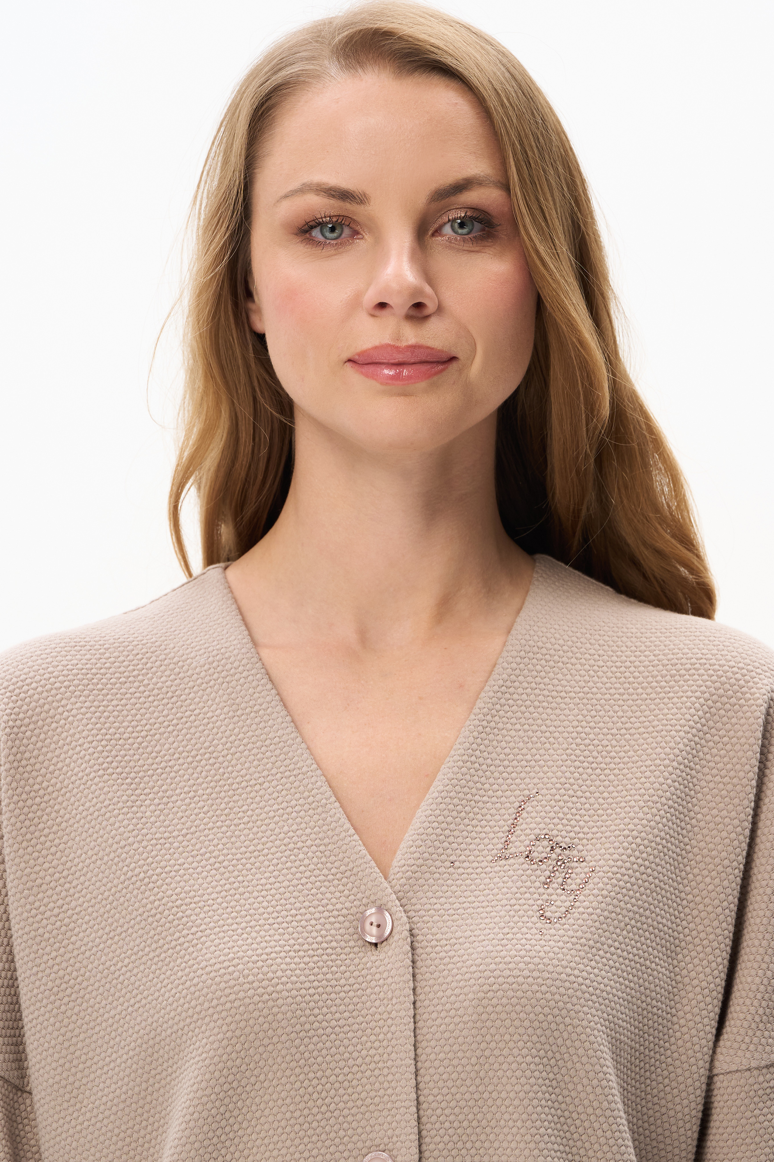 Удобный халат из однотонной хлопковой кулирки-жаккард с эластаном качества пенье 200 гр. Полотно мягкое, эластичное с новой интересной фактурой в оттенке мокко. Модель в стиле кимоно, прямого силуэта, длиной до колена, со спущенной линией проймы, рукава широкие длиной 7/8. Застёжка на пуговицы и красивая аппликация LORY из мерцающих страз. Интресная новинка для дома и отдыха.Похожие товары
