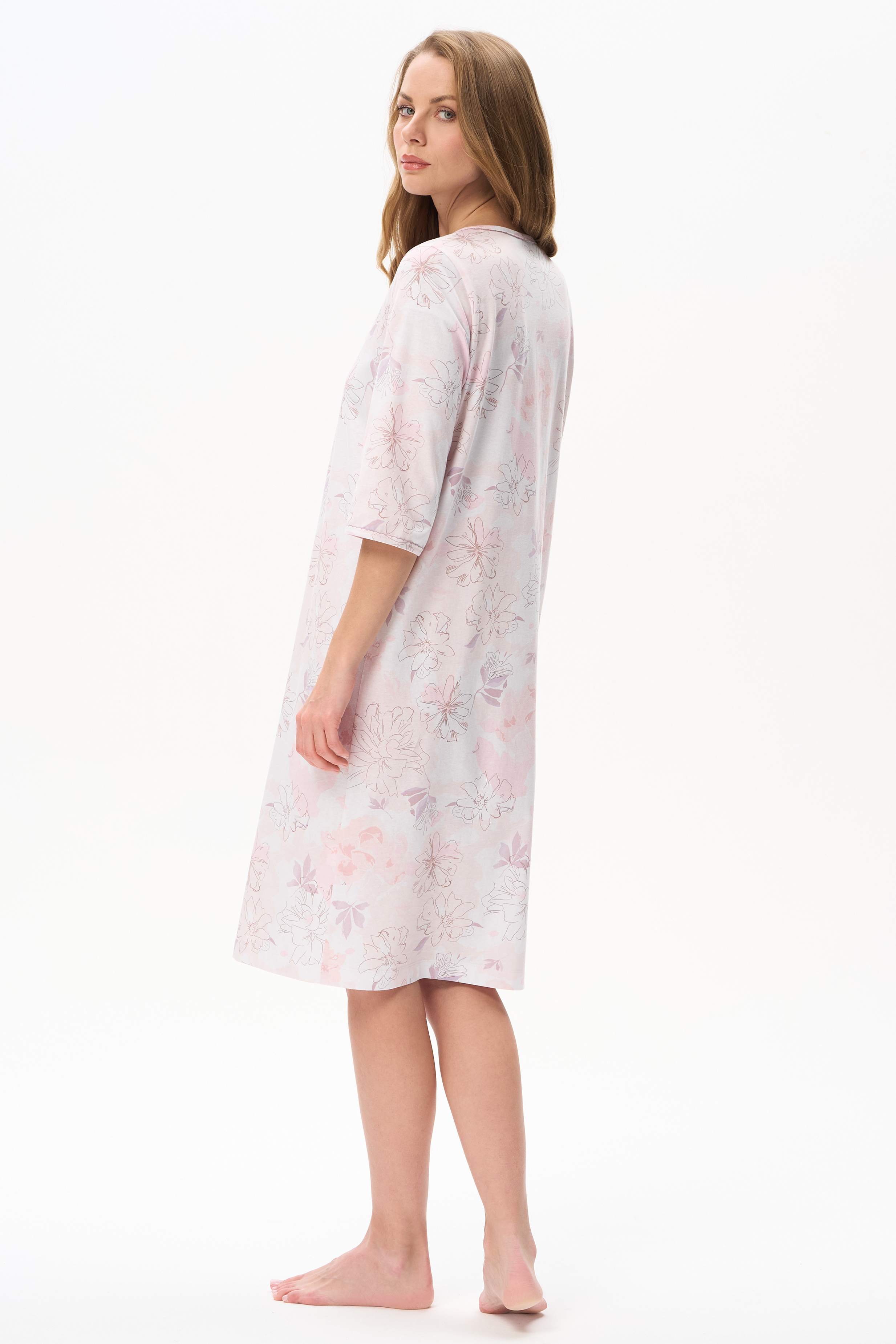 Сорочка из кулирки качества пенье 150 гр. Дизайнерский рисунок в стиле LORY - Акварельный цветочный принт с тонкими изящными линиями в нежных розовых тонах и оттенке мокко. Модель длиной за колено и рукавами до локтя, по горловине и краю рукавов украшена ажурной строчкой - "мережка". Удобная застежка на пуговицы.Похожие товары