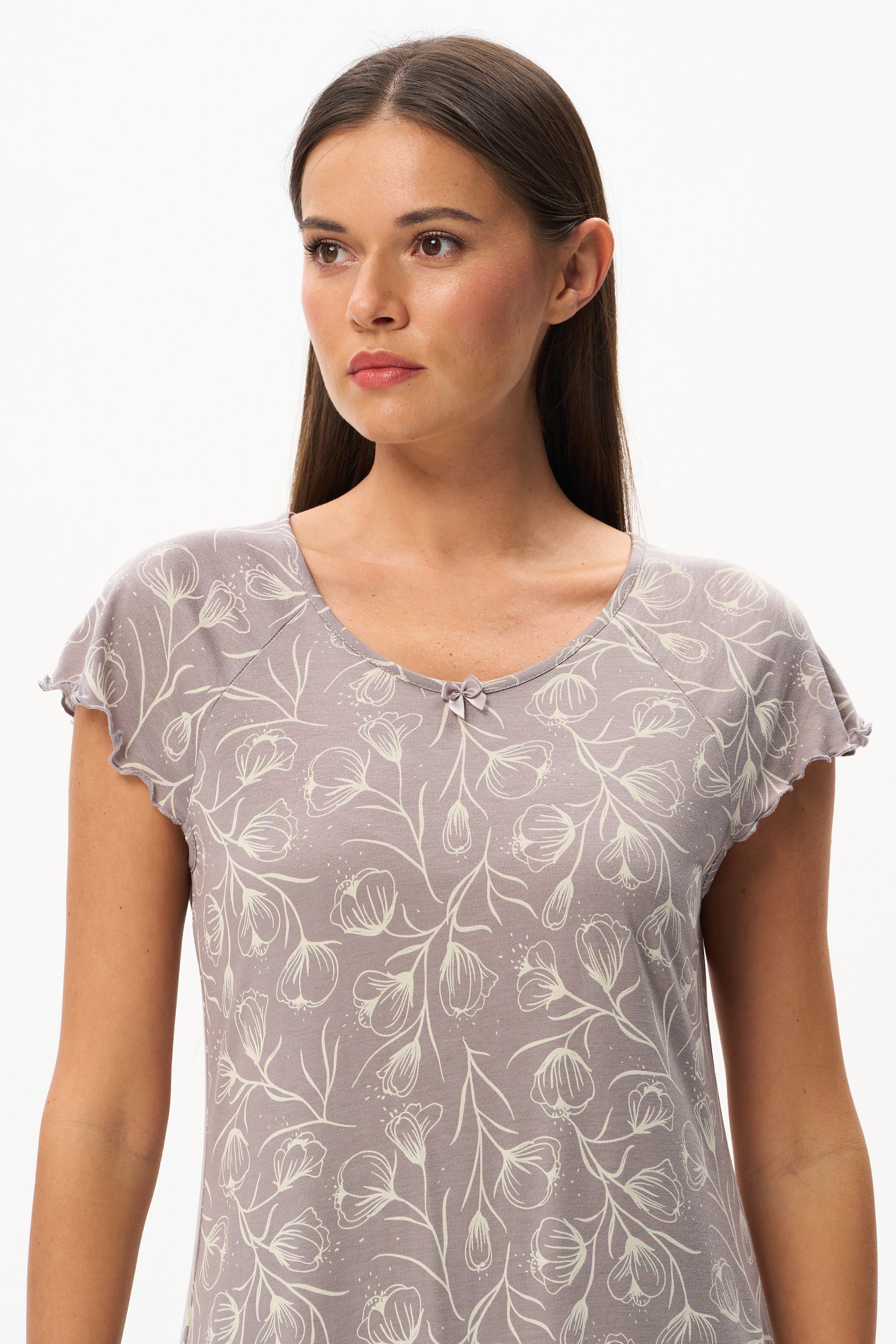 Сорочка их вискозы качества вортекс мягкая, шелковистая, 160 гр. Дизайнерский рисунок в стиле LORY - Контурная цветочная графика Распускающиеся бутоны в Сливочном оттенке на фоне Перламутровое облако. Вискозное полотно прекрасно подходит для модели с рукавами "крылышко". Край рукавов и низ изделия с декоративной рюшей, длина до колен. Красивый вырез подчёркивает женственностьПохожие товары
