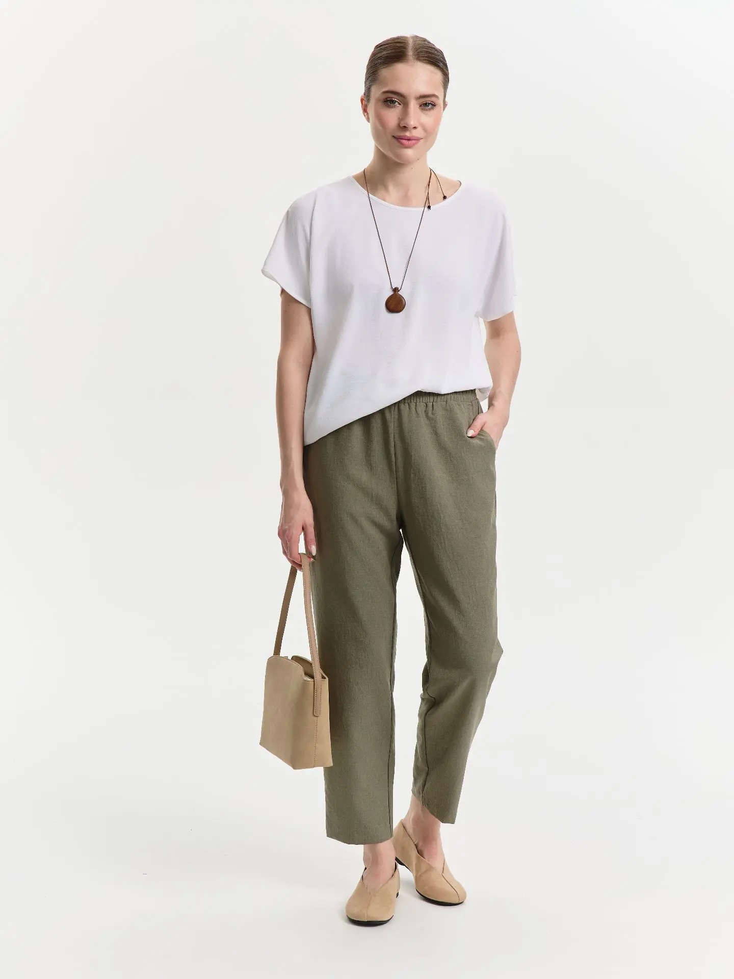 На передних половинках действующие карманы. Талия регулируется шнуром. Заужены книзу.Похожие товары