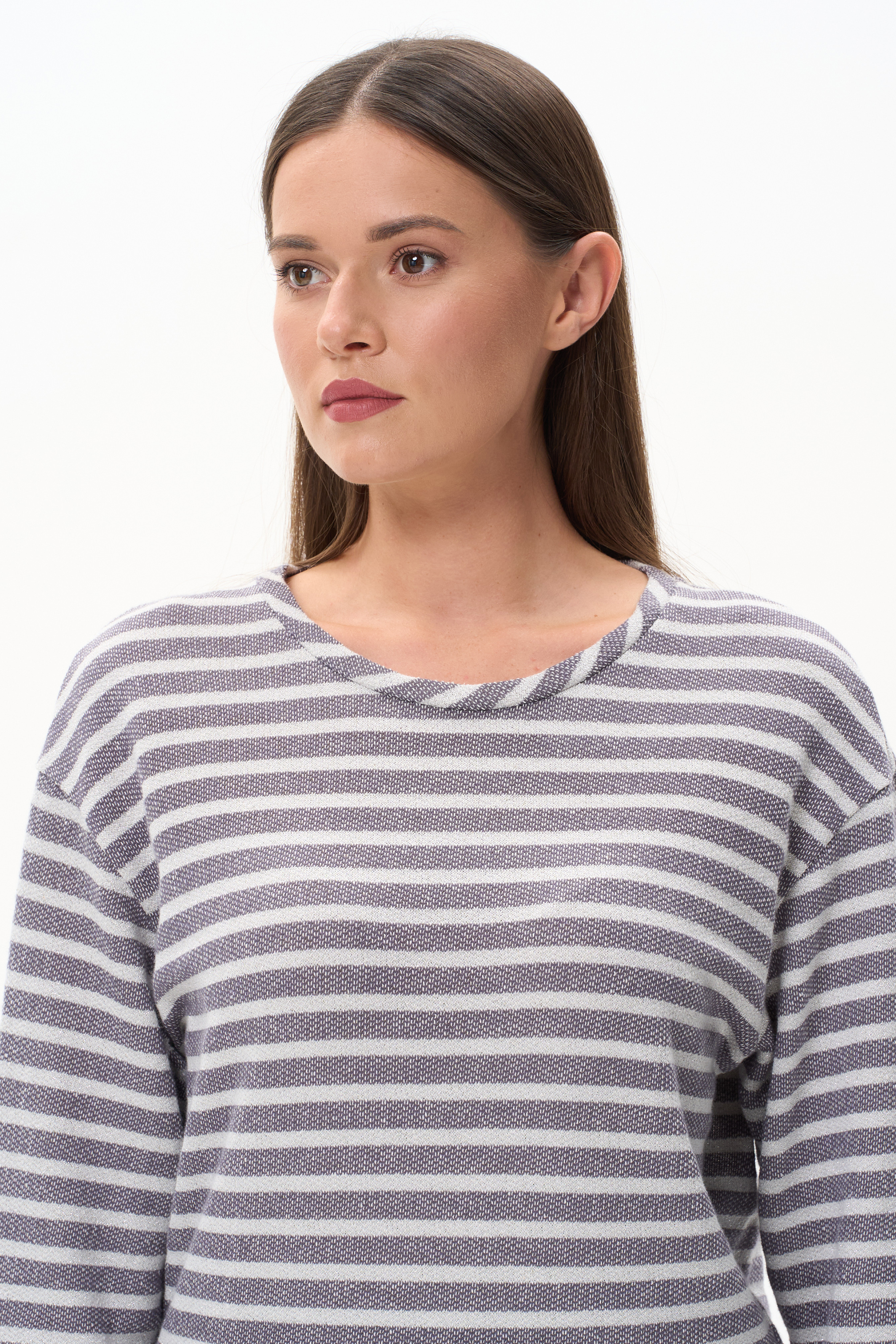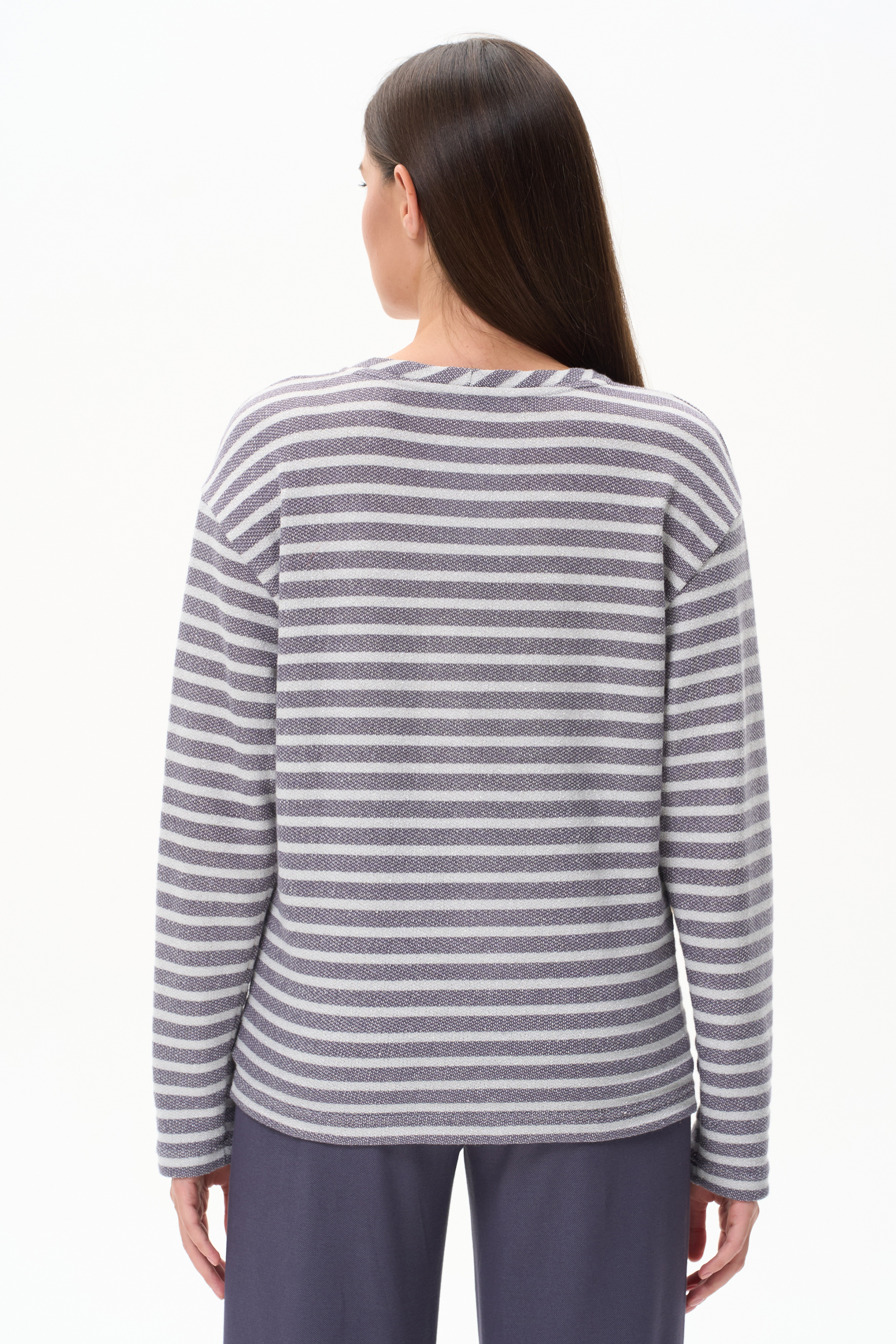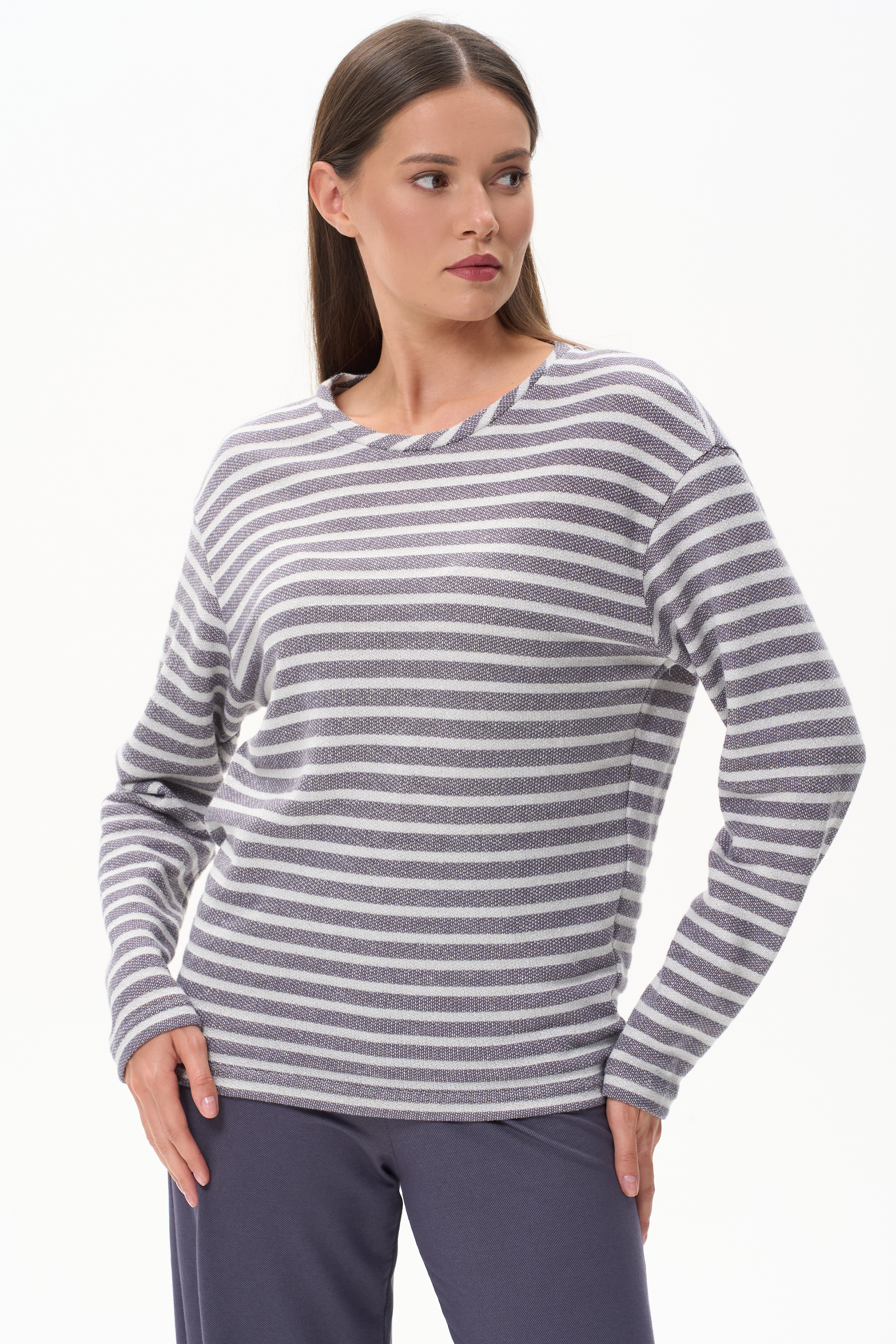 Джемпер из фактурного жаккарда в полоску в оттенках коллекции 200 гр Модель нового силуэта - свободный в плечевом поясе и прилегающий по бедрам, длинные рукава со спущенным плечом и круглая горловина. Серебристый люрекс в составе полотна придает эксклюзивный вид изделию.Похожие товары