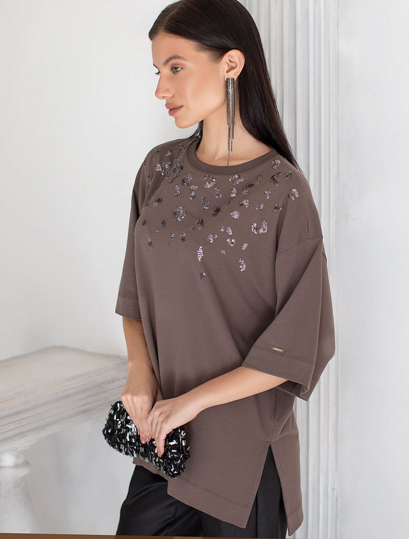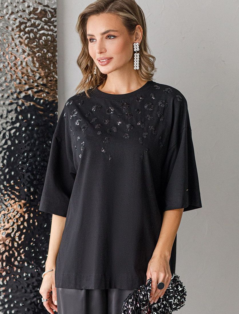 Оверсайз футболка черного цвета из премиального хлопка с добавлением эластана создана для комфорта и стиля каждый день. Натуральный материал приятный к телу, дышащая ткань хорошо держит форму и подходит для повседневной носки дома, в офисе или на прогулке. Классический свободный крой, удлиненный прямой силуэт и свободная посадка делают эту базовую футболку универсальным решением для любой фигуры и роста, включая плюс сайз размеры и беременных девушек, отлично скроет животик. Широкие рукава держат форму и подойдут на полные руки. Нарядная футболка украшена авторским принтом пайетками. Такой акцент делает модель уместной как для особых случаев, так и для ежедневных образов. Такая эффектная длинная футболка станет универсальным дополнением гардероба, позволяя создавать разнообразные образы с акцентом на современный стиль и утонченность деталей.