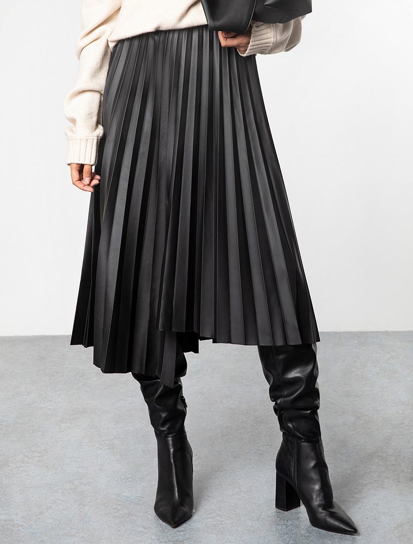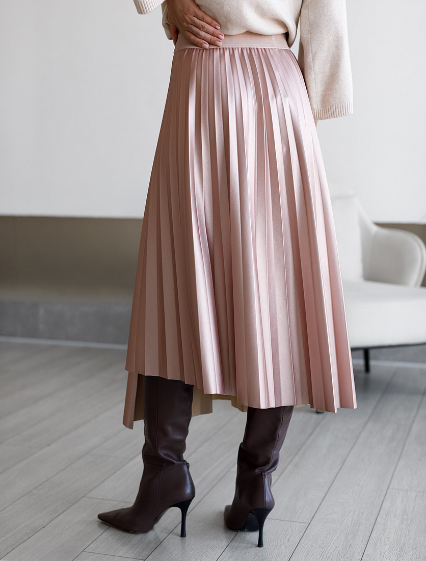 Асимметричная плиссированная юбка выполнена из мягкой эко-кожи. Посадка на талии акцентирована поясом из эластичной вельветовой ленты. Перламутровое покрытие изящно сияет и легко поможет создать роскошный вечерний образ. На уровне ассиметричной линии спереди находится разрез, открывающий ноги. Атласное внутреннее покрытие обеспечивает идеальный комфорт при носке с колготками.